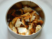 Potrei scrivervi che ho tagliato una fetta di pane freschissimo a cubetti e invece no! Sappiate che ho usato del pane secco e vecchiotto. Di quelli che si accumulano in cucina e non sai mai cosa farci (a parte il pangrattato). Le forme dei cubetti sono quindi venute un po' spigolute, ma non formalizziamoci.
